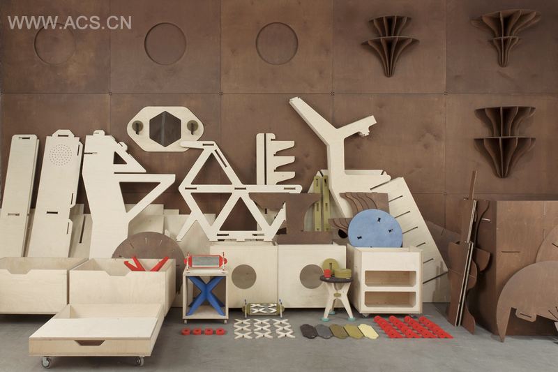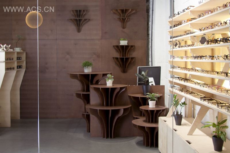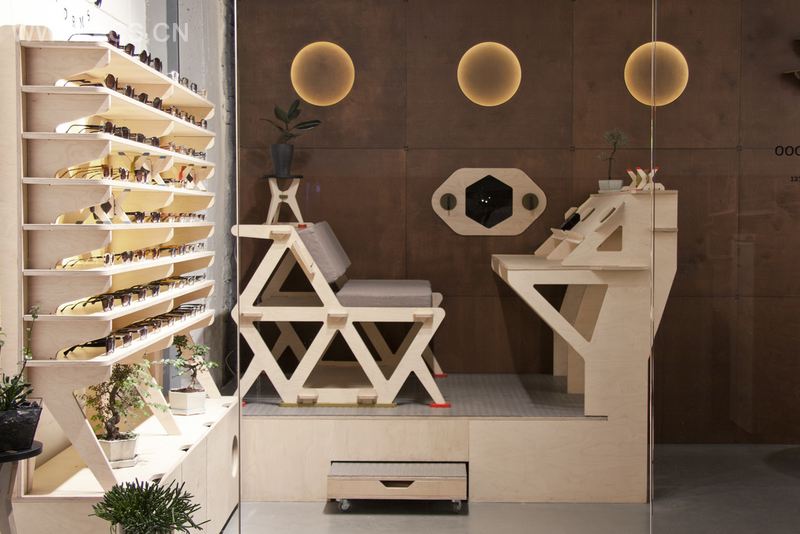 该项目灵感来源于复古未来主义,室内用具用477块胶合板组合而成,一个有趣、清新的购物空间