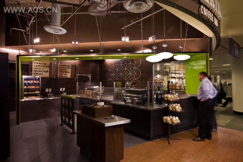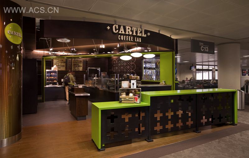 本店位于凤凰城国际机场4号航站楼C11-C20门附近,卡特尔咖啡室为咖啡鉴赏家提供各种咖啡以供选择。空间设计的灵感来自于品牌注重新鲜的理念,使用当地工艺烘烤的咖啡豆。566平方英尺的空间,大胆的莱姆绿的标志、墙面和天花板吸引着过路人的眼球。明亮的色彩与温暖、工业化的设计元素相抗衡,例如墙面和地板上能看到的一些设计、不锈钢柜台面和电器、将木质菜单固定的链式结构以及划定消费者排队点餐的金属分隔。空间外部有一个吧台可供顾客在候机的时候享受咖啡和食物。温暖而有魅力空间,告诉顾客这里有美味和咖啡和食物。