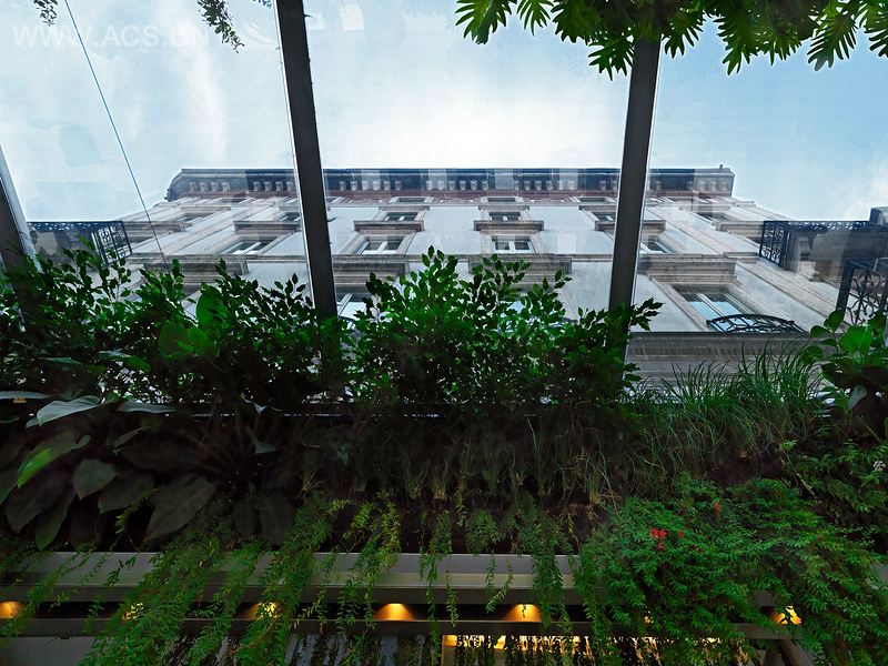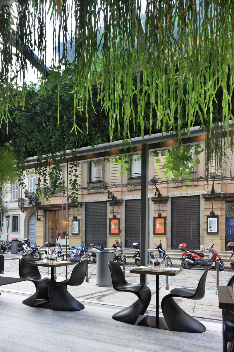 在对米兰斯卡拉广场时尚商店总部一楼的新功能的研究启示下,特鲁萨尔迪咖啡馆扩建案提出了扩建一个法国风格的封闭阳台。新的阳台就如一个玻璃柜,悬挂着一个从房顶伸展下来的花园,即由法国植物学家帕特里克·布兰克打造的绿墙。这个薄薄的支撑架上种植有120 多种不同品种的植物,创造出绿云在空中浮动的效果。种植了100 平方米植物的垂直花园被引入广场,但没有占用一点儿地表面积,除了营造视觉效果之外,还改善了空气质量,也为夏季乘凉提供了绿荫。整个建筑也因使用富有生命力的元素做建筑材料而有了自己的新陈代谢,成为了一个有机体。