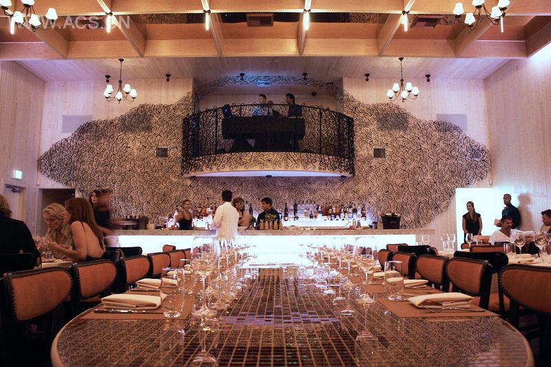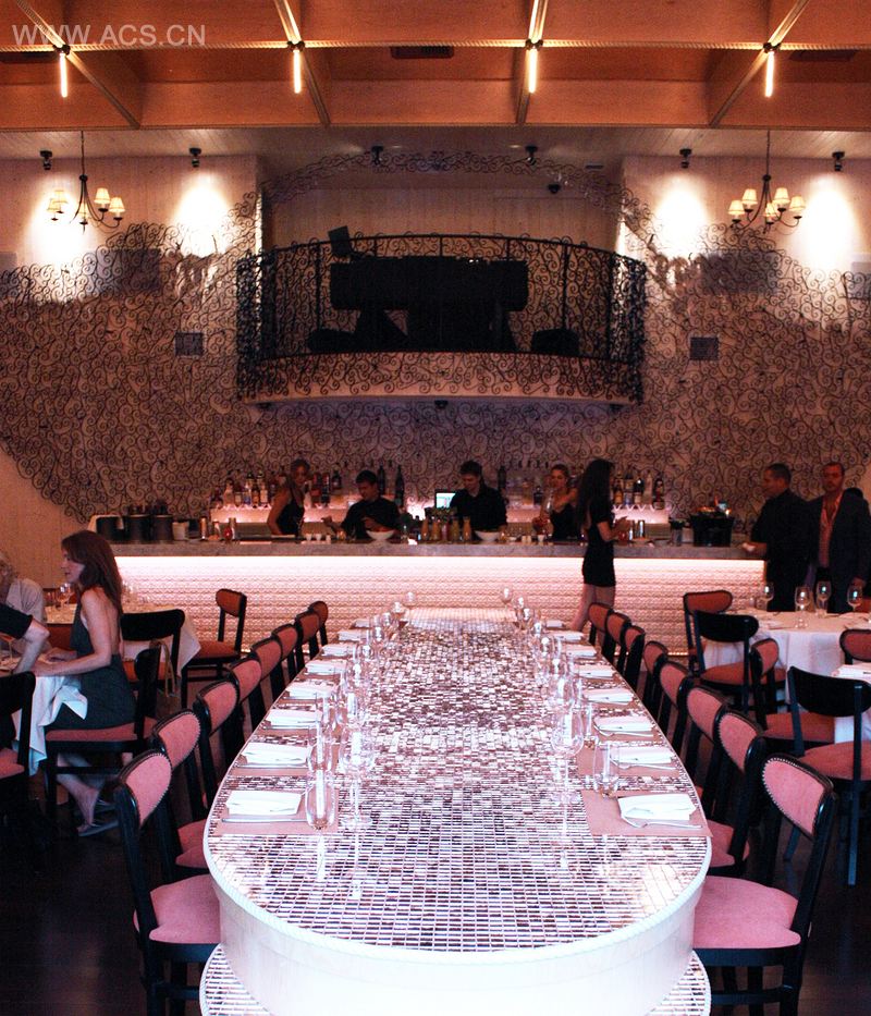 The fluid beauty and flavor of the eponymous wine are present in the mobile reflections of the copper cladding, the glazed and mirrored tiles, the graceful softness of the banquettes.