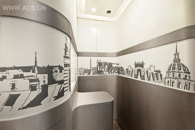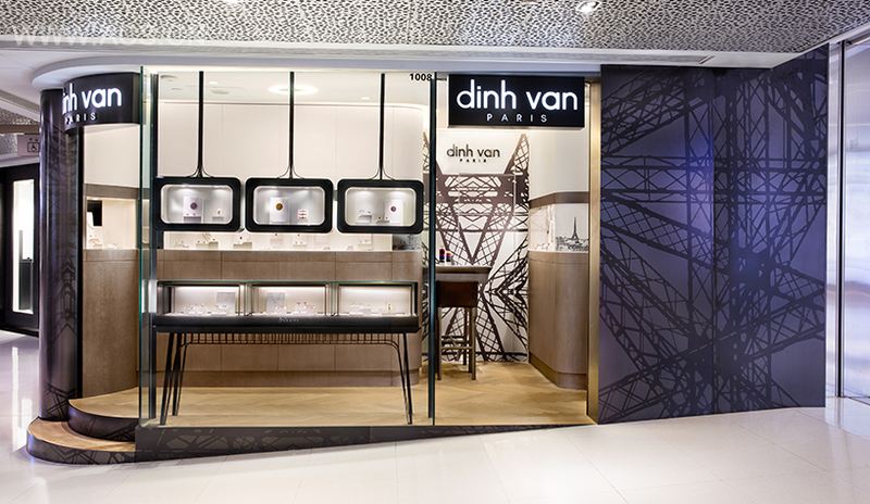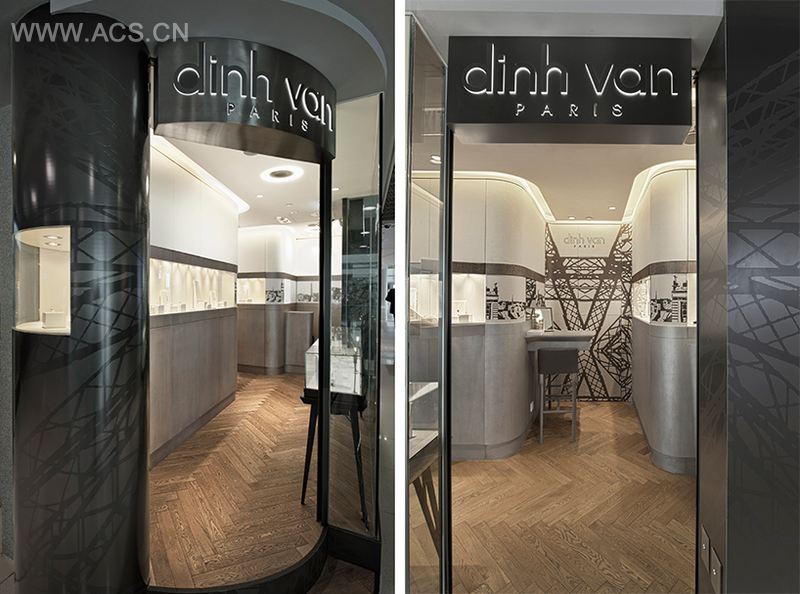 Dinh Van品牌在法国各地闻名,尤其是在巴黎。于是, Stefano Tordiglione Design 充分利用这个特徵,整个珠宝店都参照了法国首都巴黎的标誌性建筑物。炭灰色和白色图案是其墙壁的特色,墙壁为铁艺建筑结构的一部分,这立即使人想起了巴黎的埃菲尔铁塔,吸引游客去巴黎的情景。墙身的其他部分是黑白相间的印刷品,它们都曾用于Dinh Van的广告活动,展示巴黎的万神殿和协和广场,增添了设计理念的紧緻效果。这款设计已获得2014年现代装饰国际传媒奖——年度商业空间大奖。