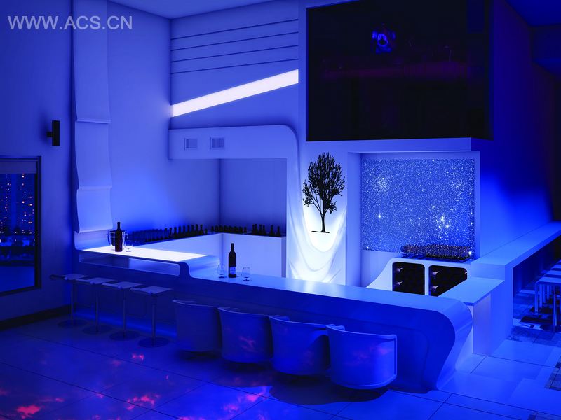 主要材料是一种名为“可丽耐”的白色光泽丙烯酸聚合物,加热后可塑成任何形状,在板灯的照射下形成对比。新酒吧是整个设计空间的纽带。俱乐部里的灯光组合由大胆奇异的蓝色灯光和红色灯光组成。这里还设有加高的DJ台,被深色玻璃包围着,晚上玻璃会从里面发光。