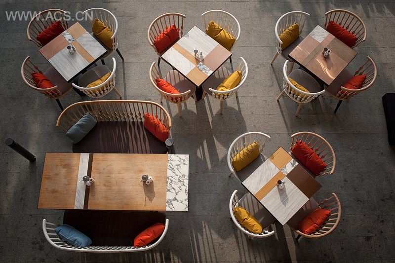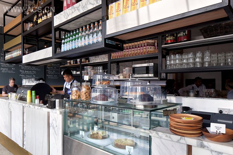 浅色的木头,黄铜和大理石被拼凑在一起,形成店内的桌子和柜台,与社区集合的精神相一致。店内没有使用不必要的装饰品或是大量制造的家具。一系列Tom Dixon 、Andreu World和Dedon的椅子和灯具为空间增添活泼的色彩。放置外卖食品的冰箱、供人浏览的杂志架、9米长的黑板墙上手写着菜单和每日特色菜,丰富了空间。