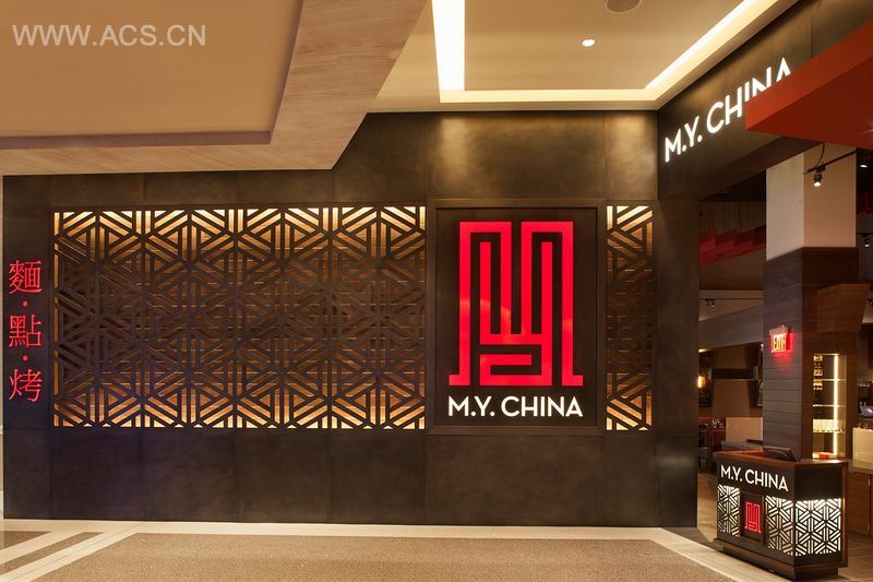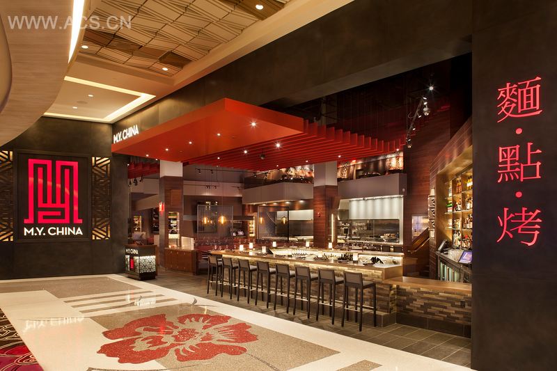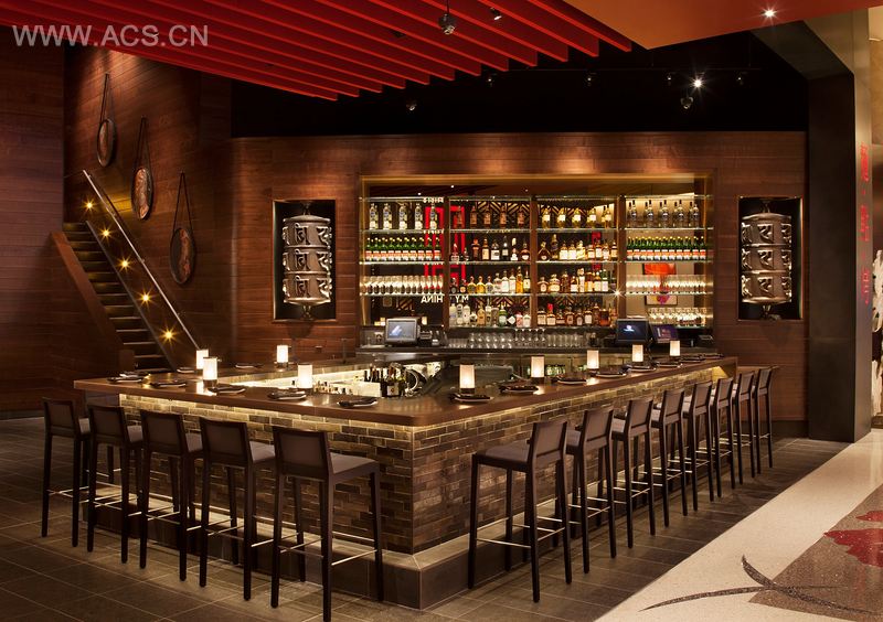 这间位于Gr a t o n赌场的新餐厅占据了两层的空间,面积达80 0 0 平方英尺( 7 4 3 . 2 平方米),室内使用的材料有胡桃木、石板和黑色不锈钢。顾客进入赌场, 穿过欢迎吧台和红色板材制成的特色天花板元素,进入餐厅。餐厅内有175个座位,首层有多个餐饮区域:吧台、“寺庙间”、主用餐空间和沿着展示厨房设置的吧台椅区域。“面条舞者”是展示厨房的明星秀,展示了制作新鲜面条的全过程。胡桃木包覆的阶梯上饰有定制的纹身艺术品,指引向夹层的用餐区域,这个华丽的用餐空间可俯瞰楼下的用餐区域,可供50人用餐。周围的空间可被隔离成小区域,用于私人聚会,具有特色的龙形墙绘由纹身艺术家Khalil Rintye绘制而成。
