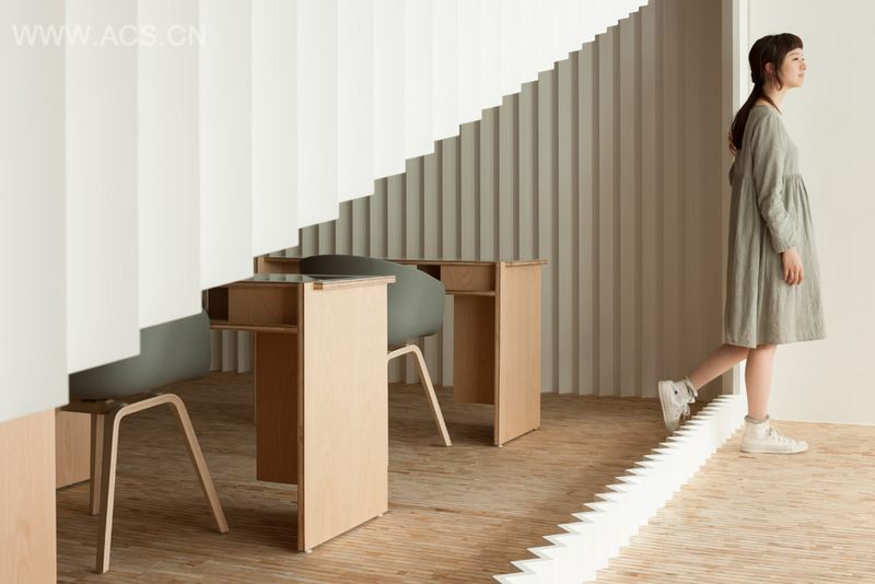 “Kolmio+LIM ”美甲沙龙位于日本大阪,是一个新兴蓬勃发展的美甲店。店名中的“Kolmio”在日语中指的是一种复杂的三角形状装饰物,为此,设计师在设计过程中使用到了三角形这一元素,在商店的动线上安排了一个三角形标志性的墙洞。与此同时,为了反映自然肤色这一主题,采用了原木和白色进行店面设计。空间中的锯齿墙以及上面的光影代表了光亮闪烁指甲油的反光