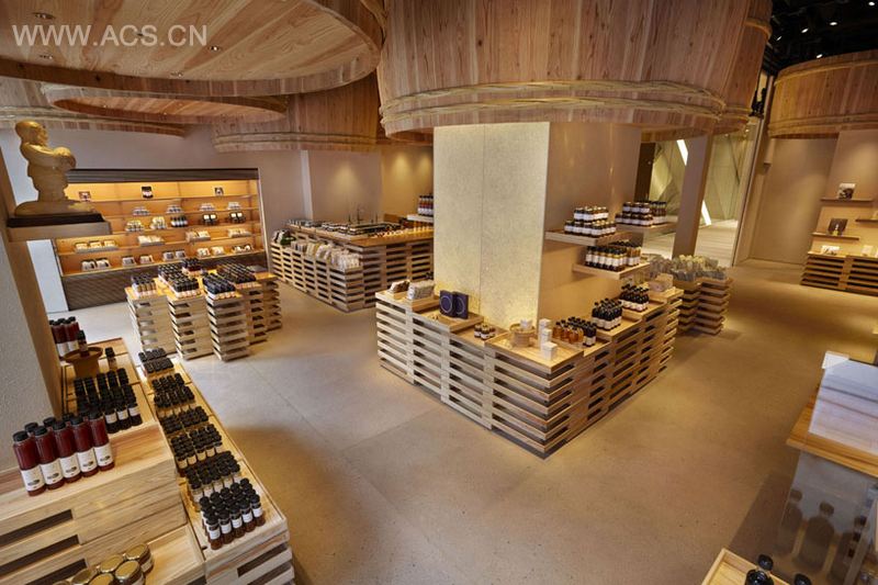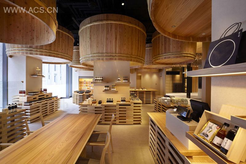 通过在天花板上悬挂制作过程中使用的木桶,使用制作koji(麦芽米)的托盘陈列出售物品,这一设计在日本南部九州再现了传统的酱油仓库。项目中所有木桶与托盘使用的柏木均由九州本地的工匠制作,这也进一步凸显了基于本土的设计的重要性