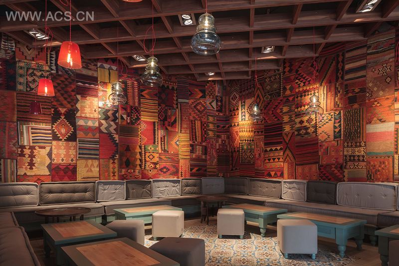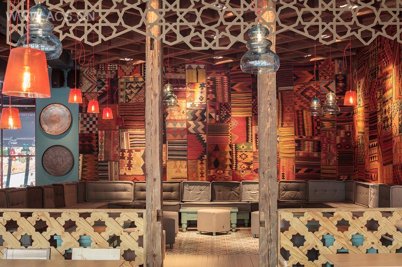 The color scheme is d on various shades of turquoise. Pendant lamps are custom made either in the shape of the Turkish fez or inspired from the nargile . The table s shape comes from the moon support on top of the mosque but also from the chess pieces. The floor features Ottoman motifs cement tiles while walls in the bar areas are covered in traditional Iznic ceramic.