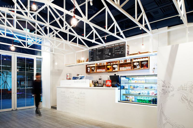 另外,灯光被随意安装在屋顶形状的桁架结构中,看起来就像天上的星星,布拉诺岛上的房屋的色彩用彩色的玻璃体现在咖啡馆的一面墙上。