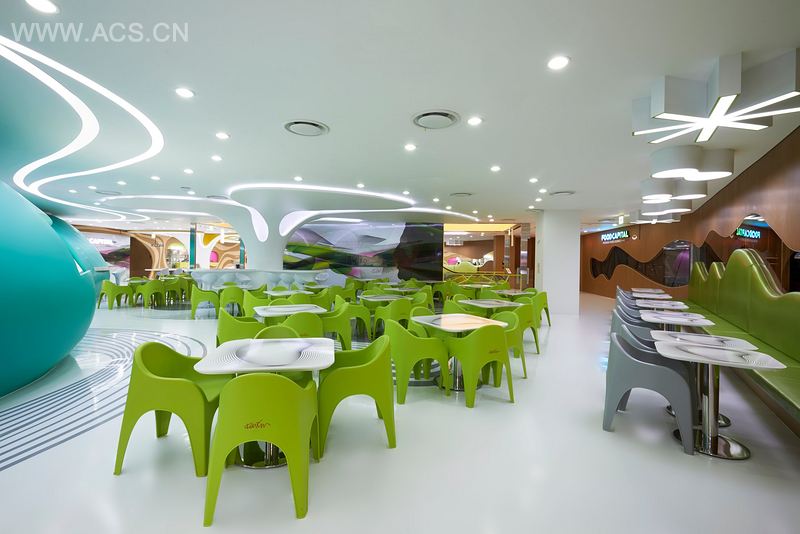 本案应用了空间感的理念,作为店内的视觉地标,创造出一个辨识度高、形象化的场所,供人们聚集、会面、社交以及享受美食。有机的“岛”不仅为空间融入特色和现代美学,同时也作为每个区域之间的关键地标。自由形状的天花板确保了视觉流通,同时提供隐蔽的局部照明。采用离心的安排方式,邀请顾客在空间内进行互动交流。设计师创造出一个动感的环境,产生聚集的空间感,最终成为一个成功的空间。波浪状的区域内的穿孔,与服务柜台建立视觉联系。小吃区域被雕刻在空间内,创造出强烈的视觉亮点。地板上的线性线条创造出强烈的线框,在空间内营造出连续不断的动态感。