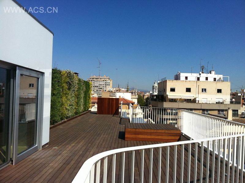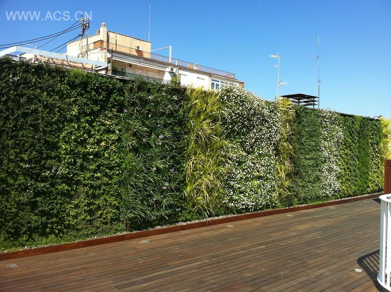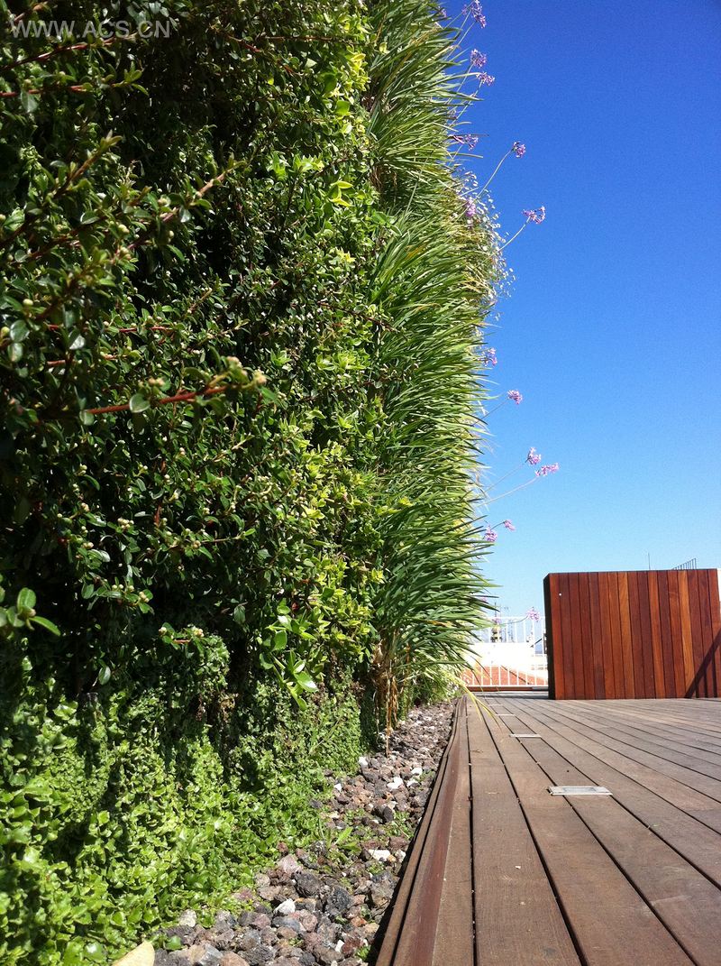 垂直花园位于穆尔西亚一座坐北朝南的顶层私人公寓里。这个70 平方米的垂直生态系统有30 种适应当地恶劣天气条件的地中海本土植物,共2 000 株。