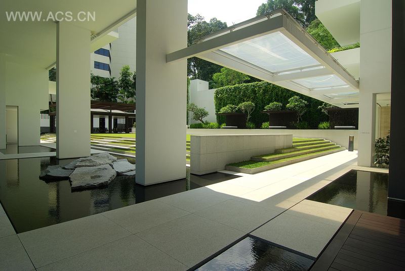 到达入口处,迎接你的是庭前悠缓的细水。入口庭院是一片宽敞的空间,院中有一个接待蓬,它看起来似乎是漂浮于洒满阳光的苍翠绿墙之上。这座绿墙,与倒映池一起,成为车辆通道处的焦点。大型开花树种与周边的绿叶植物,给人们带来别样的视觉体验。这样一来,纳皮尔路的繁华与庭院的寂静,形成鲜明的对比。热带绿色植物以及附近的植物花园,构成了这里的整体景观。每个层级的变化都循序渐进,且用柔和景观做内衬,囊括幽静的美景。