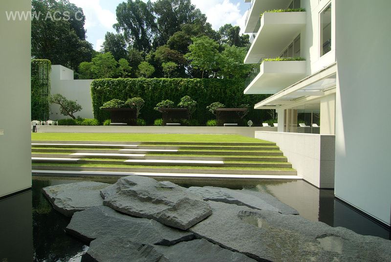 这项工程的设计理念,理所当然地源于该地本身的地势。从南至北,地势从纳皮尔路向纳森山路倾斜。根据地势特点,纳皮尔居民以宽阔的庭院通道为开端,在一大片逐渐上升的阶地中,修建了这条美丽的8 号纳皮尔路。沿着宽阔的台阶和坡道,人们可以轻松愉悦地走进这些阶地。宁静的池塘和缓慢流淌的河水,有着一种抚慰心灵的声音。在阶地最高处的50 米豪华游泳池处,最能体会这份宁静。