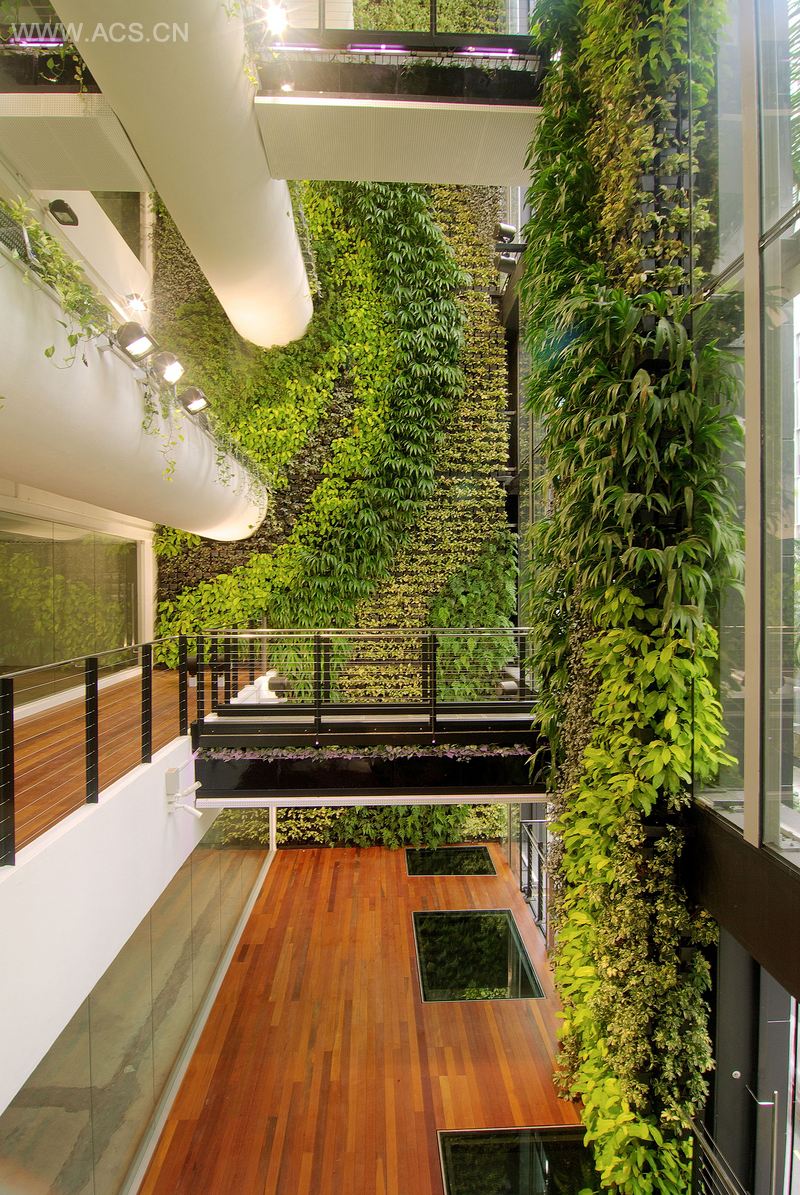 由于现有建筑增添了新的楼层,楼房面积增加,虽然塞西尔街158 号的剩余空间完全处于室内,但是只是一个被遗弃的中庭。这座7 层建筑的室内中庭是一片十分荒凉贫瘠的地方,这就为建筑团队提供了一个引进垂直的“绿色建筑”的机会,从而把这里转变为雅致的地方。塞西尔街边界线内建起了新的立面,与内部现存的后退楼板整齐并列在一起,形成了一个凹陷的外部中庭。为避免需要安装洒水装置、消防设备以及排烟系统,“外部”中庭空间需要自然通风,以满足地方当局严格的防火、排烟及通风要求。设计师们的构思是在现存的建筑空间中建造一个“空中花园”,