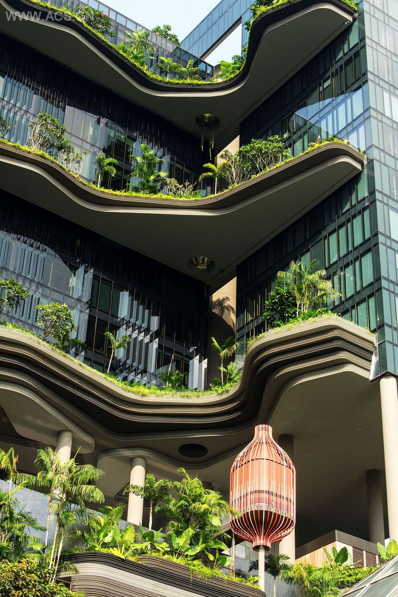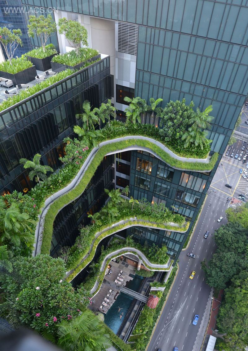 廓线优美的塔式大楼与周边高耸的办公大厦比肩而立。高耸的空中花园把葱郁的绿意引入房间和走廊、大堂等公共区域,这些公共区域装饰有漂亮的石头和水景观。自然光和新鲜空气与之相互映衬,共同营造一种度假胜地的氛围。葱郁的植物除了富于视觉上的吸引力,还给周边的城市环境带来清新之气。