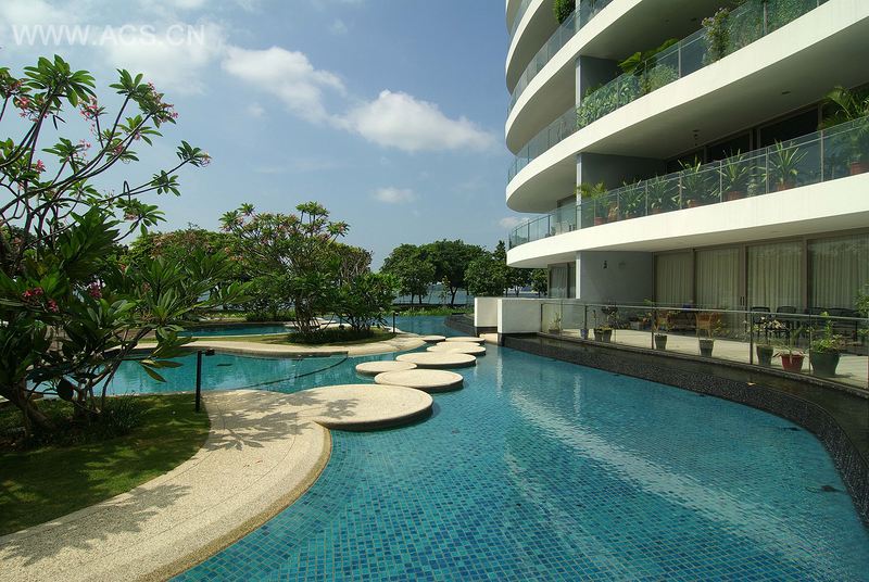 圣淘沙湾沿岸的风景浓缩了滨海生活的变迁历史。生活在城市里的人们会来到这片幽静的圣所,体验海边生活。潺潺流水声与幽深的环境融合在一起,既干净纯洁又沁人心脾。为拓展海滨人民的生活方式,景点四周被由小型健身游泳池、浅池、水疗池、休闲池、倒映池及级联池构成的大片水域围绕。作为拓展封闭私人空间的一种方式,单元首层的住户享有直达浅池的专属权,而从公共区域来的房客则可以临时使用浅池。散落在浅池周边的平台为在池边开展活动提供了互动空间。因此,虽然没有天然海滩,浅池也为人们提供了一片“海滩”娱乐场。
