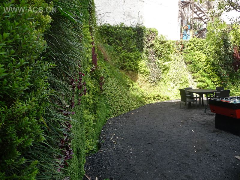 活体墙共有5 个灌溉区,同属于一个自动灌溉系统。活体墙有一部分是一个房间,用来放置储存养料的水箱。植物覆盖下是一个百分百由回收塑料做成的合成纤维毡垫。所以,植物几乎没有种在土里,而是种在毡垫内的小袋子里。毡垫的后面是一个由回收的牙膏管制作而成的塑料聚乙烯板。