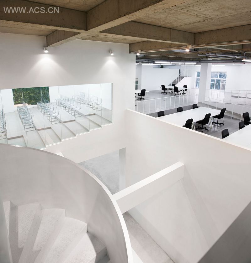 The factory building was conversed to the head office of the furnituremanufacturer. The programs are factory for 1st floor , 2nd floor and half of 3rd floor, exhibition space for half of 3rd floor, office space for 4th floor. The exhibition space of 3rd floor is connected to the 4th floor through spiral stairs where the existing floor was removed. 5.5m ceiling height is enough to make skip-floor style, so that we aimed to realize three-dimensional office landscape.
