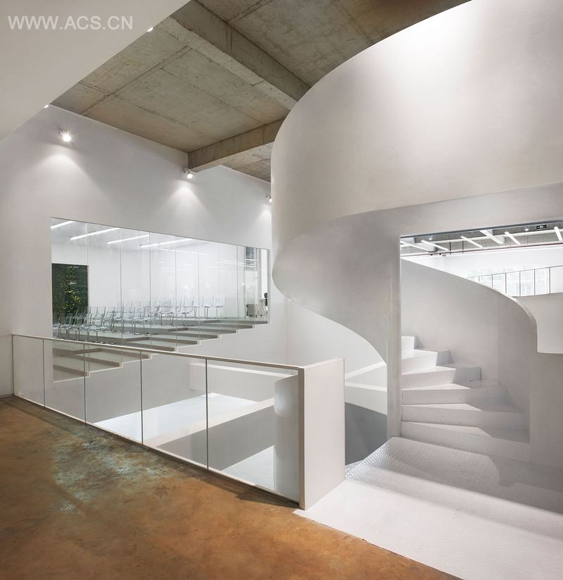 The spiral staircase that was put in the center of the floor connects the exhibition space of 3rd floor and office space of 4th floor and resting space of loft. When we enter from the elevator hall, we can see the conference room in tiers next to the void with spiral staircase. On the opposite side of the conference room across the void, there is small-sized meeting room and the volume of the resting space is flying over it. After passing through this small-sized meeting room, there is office space with skip-floor where the sections are clearly separated by the floor height also the difference of eye level induce the communication between them. When rising up to 1.2m level, we reach the back of the conference room in tiers. This conference room connects between entrance hall and office space, when not using conference room we can use this as shortcut.