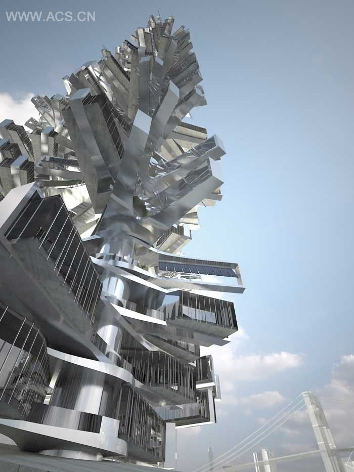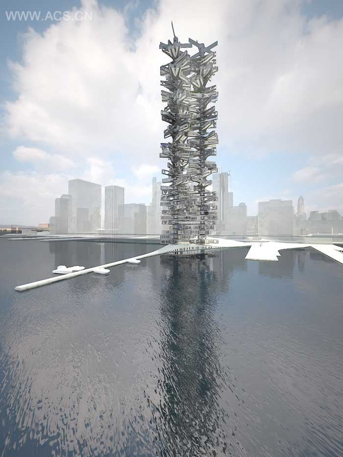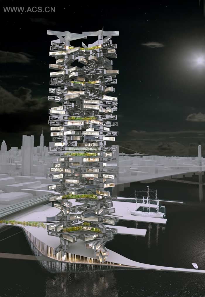 Three super-columns act as cores and as structural system. Pods are piled on and around each super-column and host residential units, or wind mills, or solar panels. Every 5-to-7 stories larger, green pods span all three super-columns to brace them in a truss-like system. Nine large-size wind mills top the tower and blur in the wind…