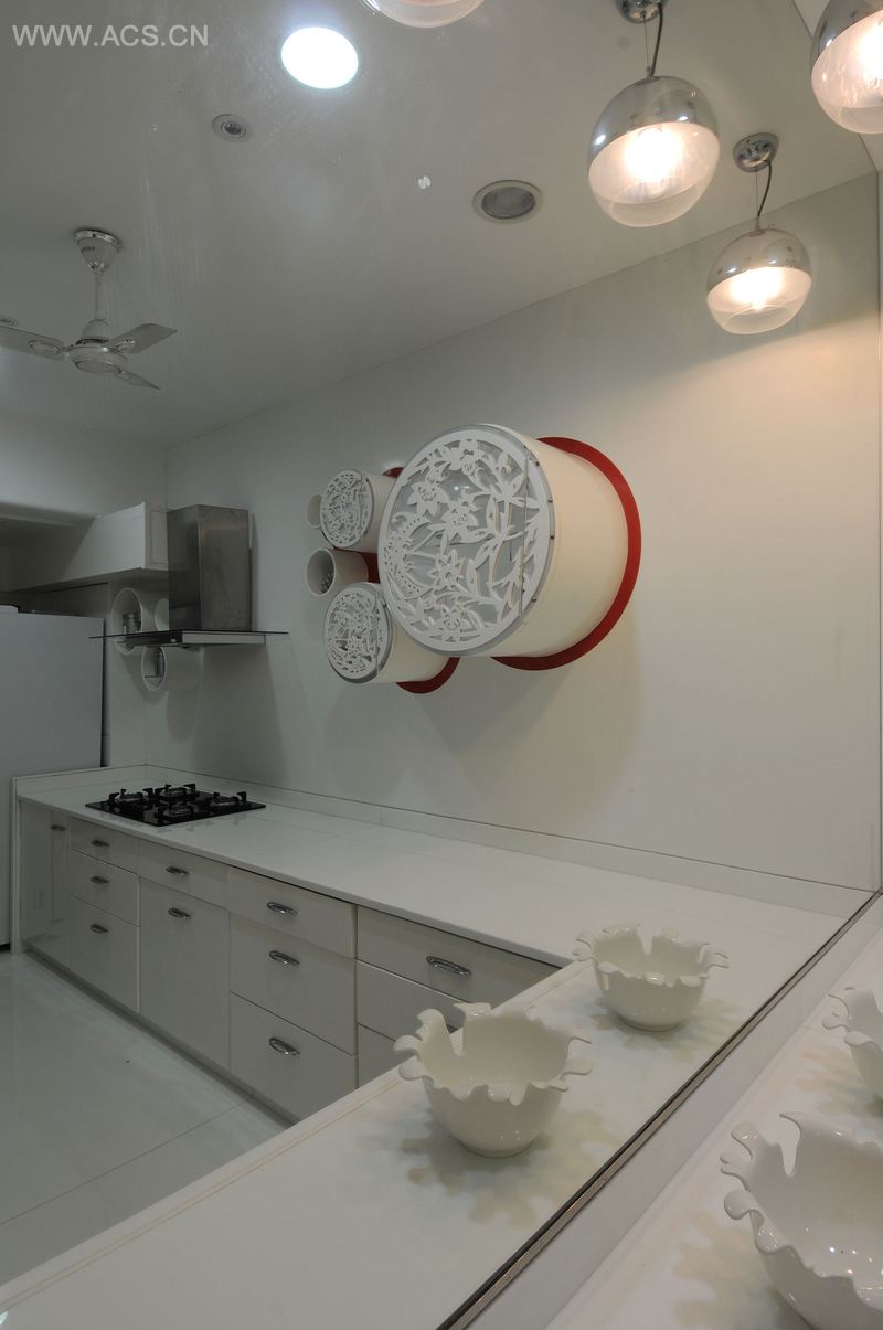 Nothing interferes with your line of vision from the living room to the dining, and then to the guest room, you see through everything. Glass walls, mirrored partitions, pristine white furniture and steel accessories only adding to the clean — lined look of the house. The little spurts of colour are provided only in terms of furnishings.