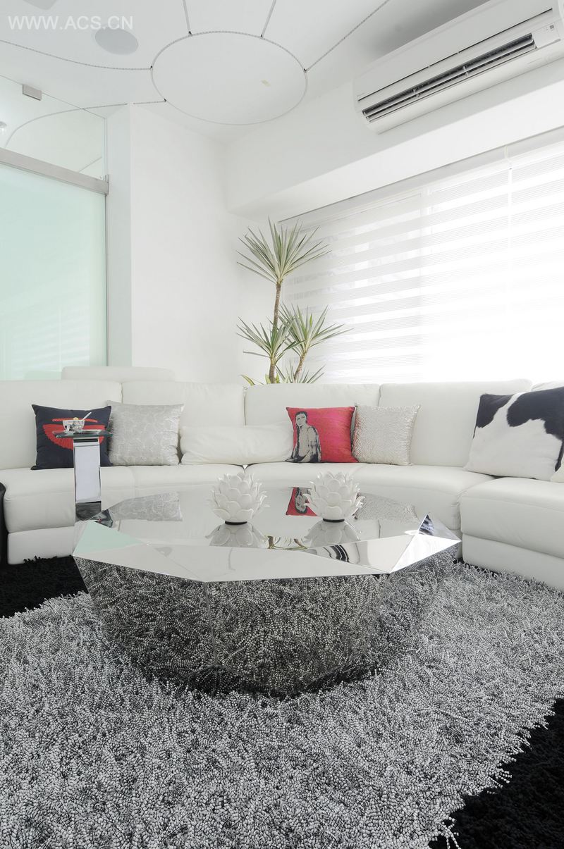 The Armani sofa, in white, lends an elegant touch to the sitting area, while the mirrored centre table adds a glamorous touch. An Anne Jacobsen acrylic hanging chair almost merges in to the design.