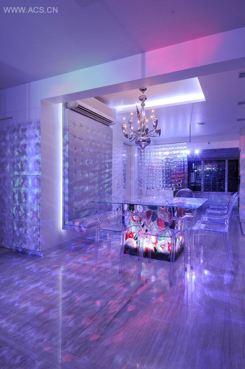 A square-shaped glass top, placed on a cube along with six glass chairs forms the dining table. The owners like to entertain a lot and in order to accommodate more people, Sonali has designed an additional cushioned ledge with a headboard that runs up to the ceiling. The dining looks into the partially open kitchen.