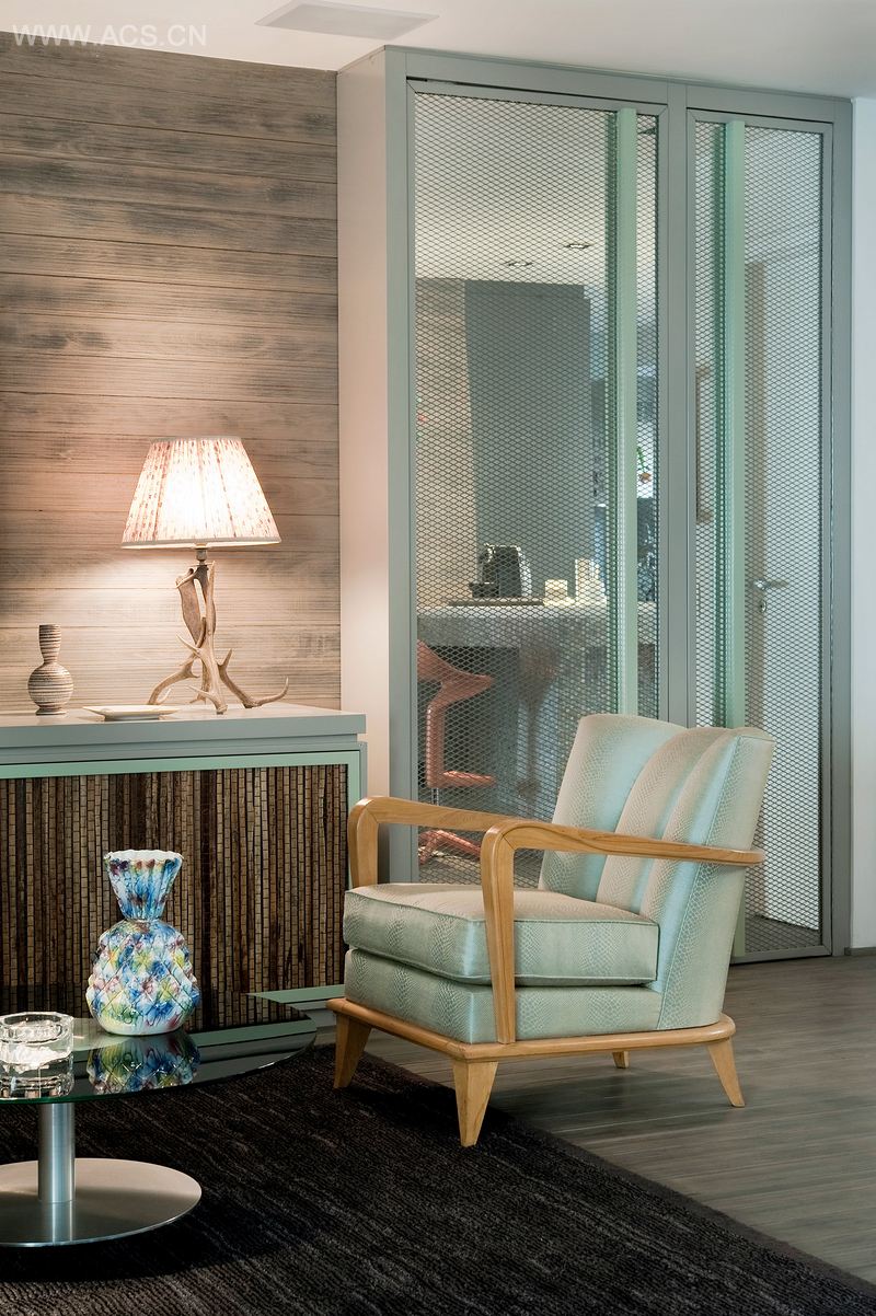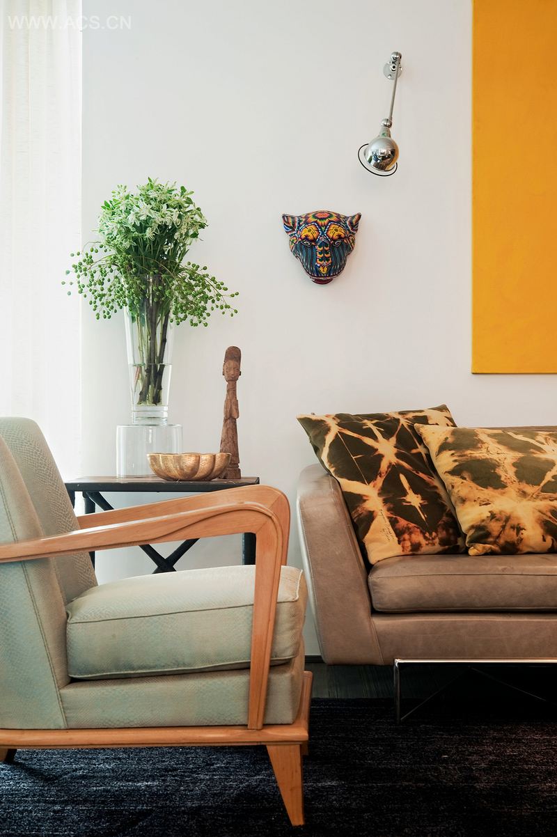 木头那灰色的色调让我们放心大胆地使用如天蓝色这样靓丽多彩的颜色,并配上诙谐风趣的装修风格。屋内的家具和装饰品是古式家具和现代设计的美妙融合,绿橄榄色的皮沙发,decó 扶椅,还有一些时尚现代的元素,如扎染风格的坐垫。