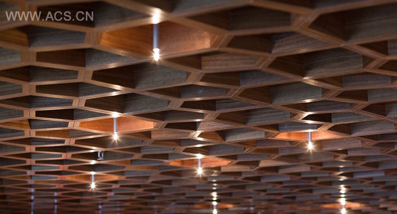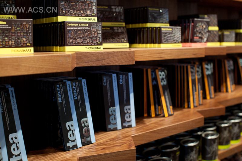 Thomas Haas蛋糕店有着凸型的核桃木天花板,向下延伸至Haas成套产品的展示墙。展示墙无缝安装有冷藏展示箱。蜂窝式的天花板设有灯光音响、暖通空调和自动喷淋消防系统。