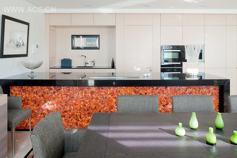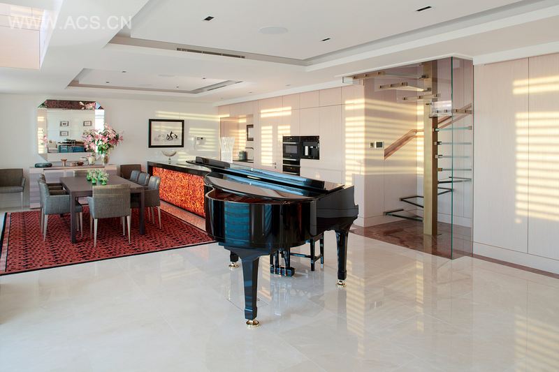 我们设计了整个住宅,以致它形成完整的开放式生活空间,没有柱子妨碍空间。在厨房和酒吧区,使用黑色花岗岩和背光玛瑙半宝石的前面板构造了一个大型柜台。空间贯穿着专门定制设计的英国华丽家具和来自世界各地的时尚家具。主卧室散发出纯净的魅力和舒适感,且拥有所有的现代便利设施。一个极漂亮的生丝床头墙散发出迷人的格调,并与黑色皮革软垫床和施华洛世奇水晶装饰软垫形成鲜明对照。华丽设计的定制的梳妆台和带奶油色皮革抽屉的床头柜,放置在闪闪发亮的豪华丝绸地毯上。通过一个隐匿的门进入主卧室,展现在眼前的是一个精致而令人兴奋的空间。墙壁上覆盖着亨利八世大理石,玻璃墙将淋浴和卫生间分隔开来。组合式梳妆盥洗盆是定制设计的,由可丽耐制作而成,上面有一个水片架。为了映衬它,安装了镜面天花板,营造一种高度和空间上的错觉。