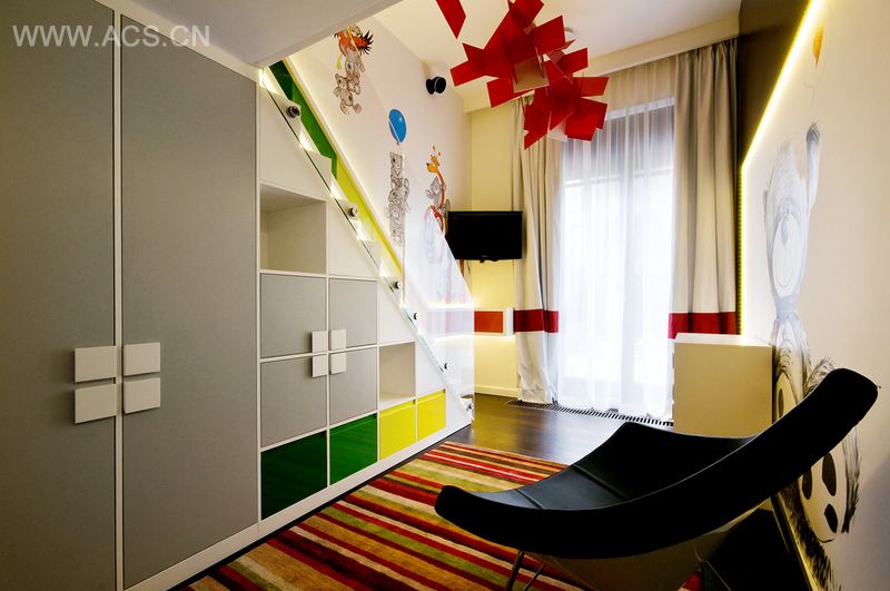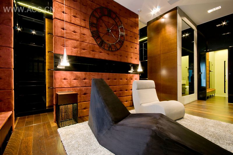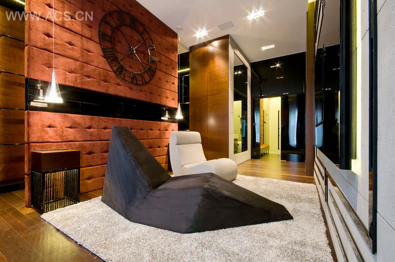 The apartment is located in the neighbourhood of one of the chief Warsaw parks and has the area of 200 sqm. The owner’s top priority has been the space finished with diverse materials. The investors expected top quality natural materials which are at the same time not too popular for the interior arrangements. Thus the stone and wood have appeared as the facing applied, however not in the form of marble or travertine and dark weed instead of the exotic wood which is so popular nowadays. In the effect the apartment has been achieved where every wall has been designed thoroughly and finished with the exclusive materials. In the corridor on one side there are upholstered panels with copper elements. On the other side of the corridor there are laminated glass panels decorated with 3D graphics. The full-height door of the corridor finished in black varnish and provided with the night time LED lighting. In the entrance hall there is provided three metres high mirror made of copper. The hall walls have been covered with the bent varnished panels where the bent doors are also hidden. The floors are made of the natural basalt and stained oak. The kitchen is separated from the dining room by an isolated island-shaped low wall completely made of stone (including the drawers’ front side). The main wall in the living room is covered with large size concrete slabs. Bio-fireplace situated in the recess finished with stone has been surrounded with the upholstered panels. The bathrooms have been finished also with the application of the exclusive elements combining various stone kinds (limestone and basalt) and wood with the glass elements. Only two rooms intended for the children have been finished otherwise with the emphasis on the individual character of these spaces to reflect the children’s tastes.