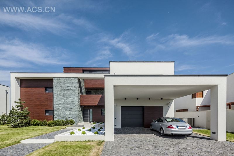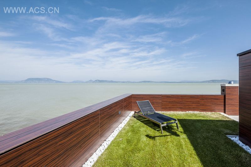 大多数房间都面向巴拉顿博格拉尔湖,毗邻的湖和别墅的高度带来令人惊叹的别墅浮于湖面的错觉。大部分屋顶呈绿色,外立面则大多数呈白色,表面使用了dryvit 胶粘剂,以及大大方格状的覆盖物、石头外层共同打造出纯朴的乡村效果,变化多端的门窗也是一大亮点。