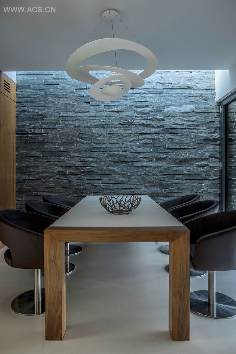 业主要求用耐久材料,以防潮、抵御特别恶劣的气候条件,数十年都不用检修。我们对于材料的选择,除了要求奢华和品质外,也是为了它的风格与紧密相连的环境相一致。例如,色彩类似狂风暴雨时的湖色的意大利淡灰绿色镶墙石板,在公寓几个地方都持续出现,视觉上衔接了自然环境和室内空间。