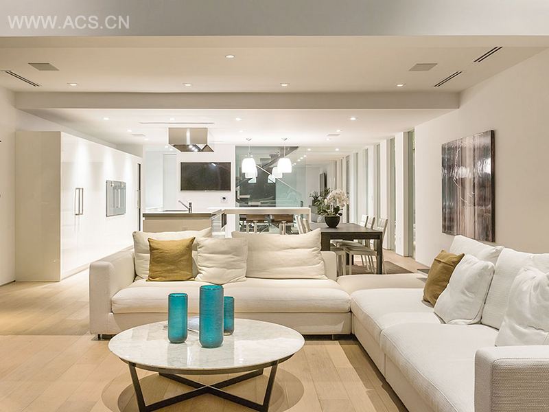 这是一个具有挑战性的改造 / 重建,因为地块狭而长,而且现存的旧结构墙体限制了我们的选择。我们的客户是一位典型的成功人士,他要求生活区既用于招待客人,又作为客人安静的休息区。这座房子沿北/ 南轴而建,建筑师从住宅中沿风景的那边加入一个倾斜的角度,用于观赏大海和落日的景致。处于中心位置的之字形“玻璃盒”楼梯是专为一楼的出口设计的,楼梯穿过住宅的各层直达屋顶。这个楼梯是一个非常实用的艺术品。所有设计都是完美的,包括形状、实用性、光,当然还有视景点。住宅是当代风格与现代风格的结合体,就像一艘有着屋顶甲板的三层高的船。