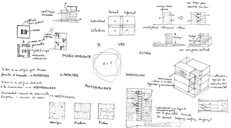 智利建筑事务所Elemental负责设计这座UC创新中心,他们认为在这个建筑中需要将四种方式的工作形式交叉融合:正式工作形式,非正式工作形式,个人工作形式以及集体工作形式。