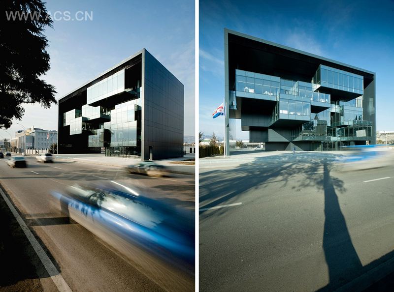 明亮而精致的体量悬浮在结实而严谨的黑色框架内。70%的结构与建筑边缘和地面分离,创造出一种“漂浮”感。空中体量在建筑的一侧形成通行道,强化了贯穿于整个设计的透明特质。错落有致的体量形成了平台和阳台。