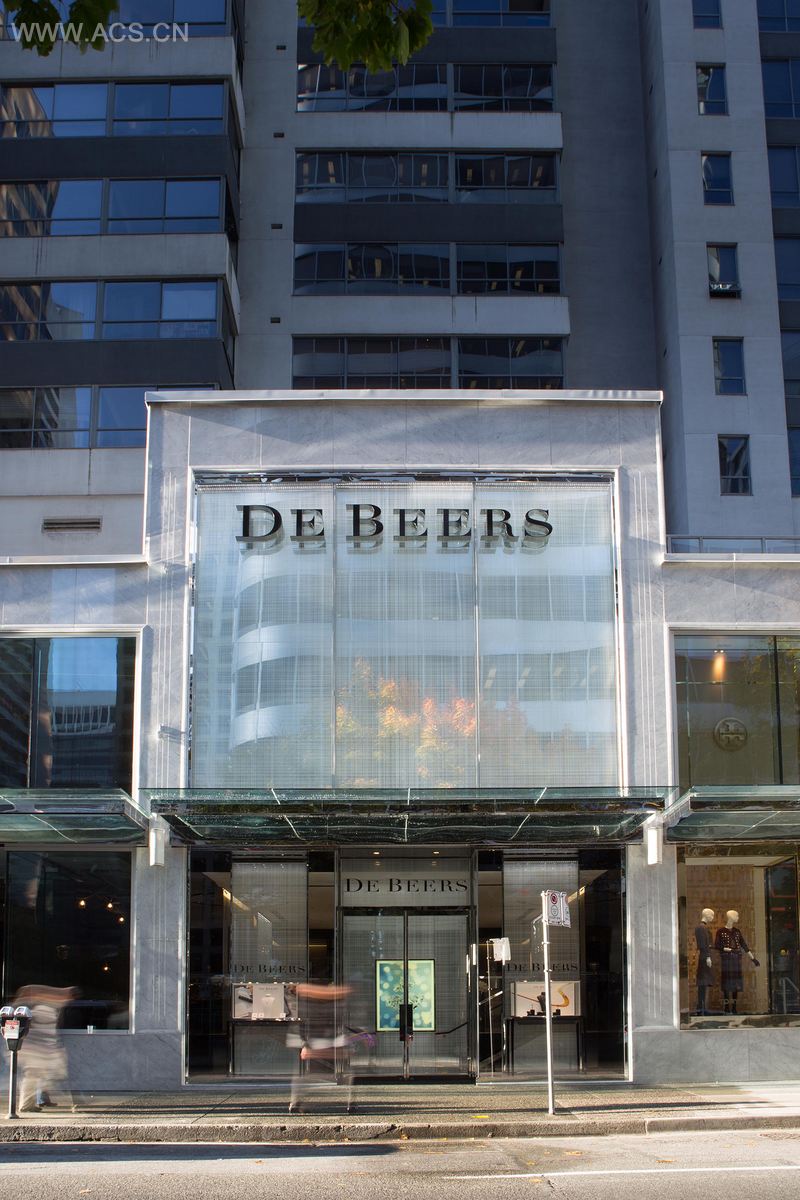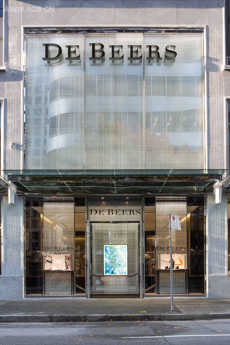 精细而强大的照明系统,经典的戴比尔斯钻石雕花玻璃图案成为店头的亮点,图案同样被用于室内墙面上。