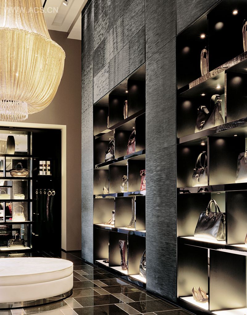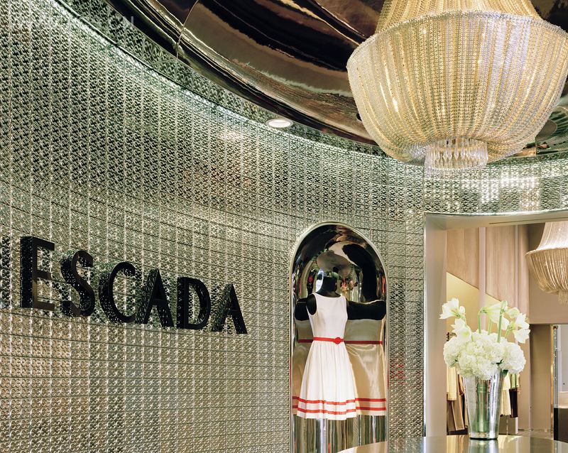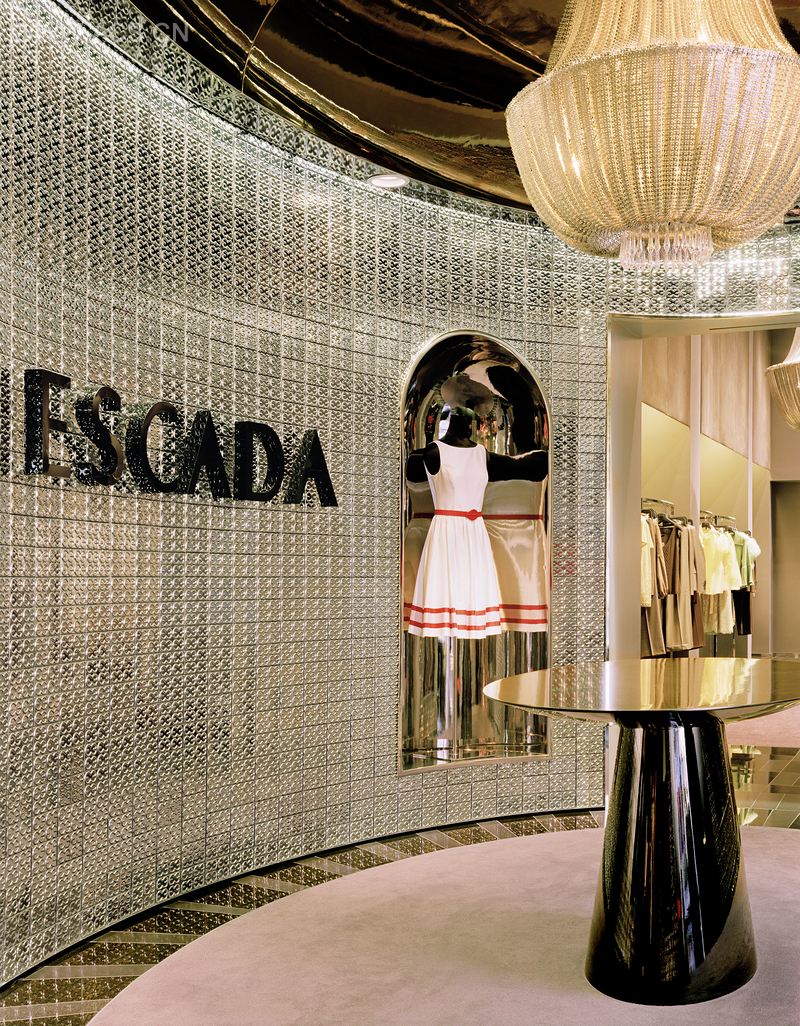 镀铂瓷砖反射的光芒与屋顶吊灯上附着的金属网栅的光辉,与深色的优雅背景形成对比。产品展示区域使用了珍贵的织物,延伸至后面垂落的帆布,看起来柔和温馨。与艾斯卡达女装的酷和个性相一致,走进店内就仿佛是在一栋奢华的宅邸中漫步,让人感觉到精心设计过的极致奢华。