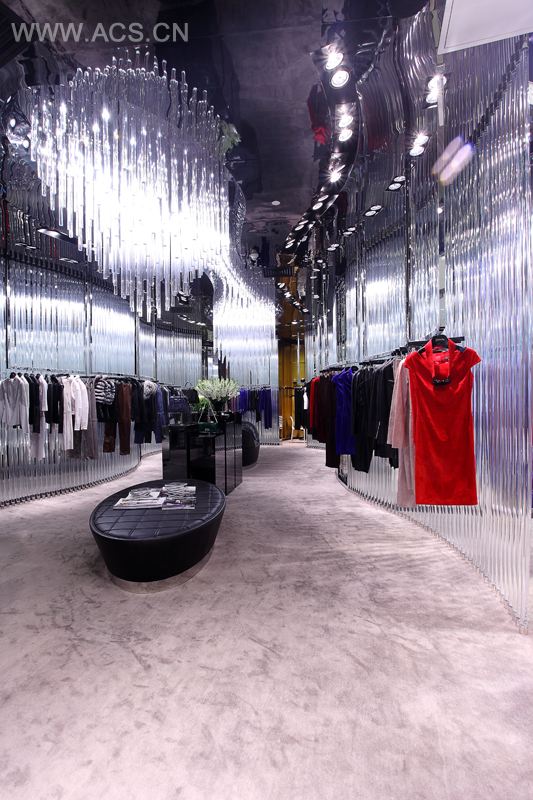 主空间周围有小型休闲区、更衣室、化妆室等。所用的材料有:灰色大理石、地毯、圆柱形透明有机玻璃栏杆、镜子、烟镜、黑色皮革、黑色穿孔皮革、炮铜、斜面窗玻璃、蚕丝粉末、黑丝、金色的金属环皮革及灰白色的天鹅绒。采用未来主义的设计风格,镜面反射水晶的明亮光芒描绘出迷人的闺房空间。所有陈列柜、橱窗和座椅都是精心挑选的:黑丝钻孔皮革、烟镜、金色皮革、抛光的垂饰等。“装置艺术”橱窗与整体空间完美融合。