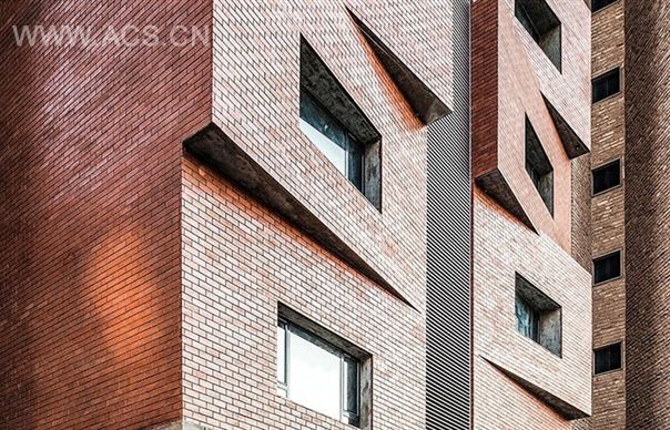 简洁的扭动节奏,通过限定轴两面顶点的变换,赋予建筑外观强烈的动态感和戏剧性。取用当地色泽较一致的天然砖块和裸露的混凝土涂层强调了堆块感,并赋予建筑独特的个性。