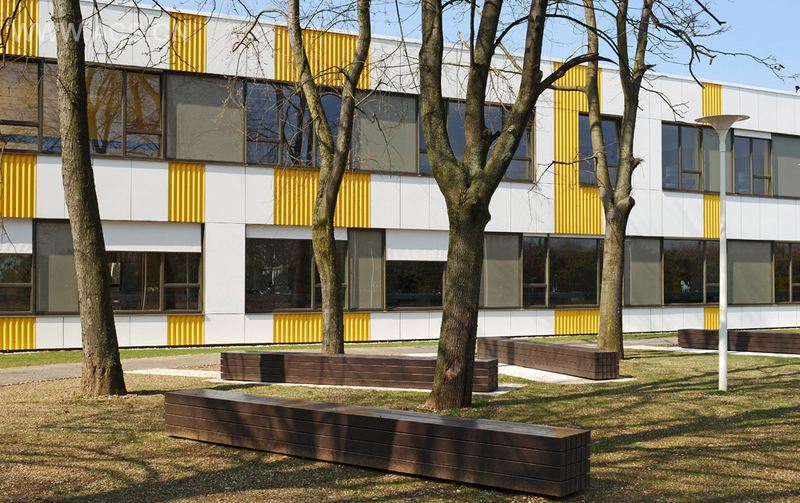 建筑符合绿色环保环境。外观由光滑的纤维水泥面板,白色水平大窗户和垂直的黄色栅格波纹板做的。