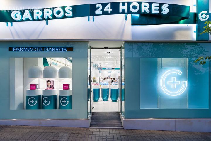一家来自西班牙的Garros药店,大胆的运用了鲜艳跳跃的天蓝色作为本家药店的视觉形象,进门望去就能明显的看到5个像药丸一样的展示台立在眼前,主打色多方面的运用在货架,产品展示台,还涉及配套的休息区域,进去买药也不会显得乏味和冰冷的感觉。