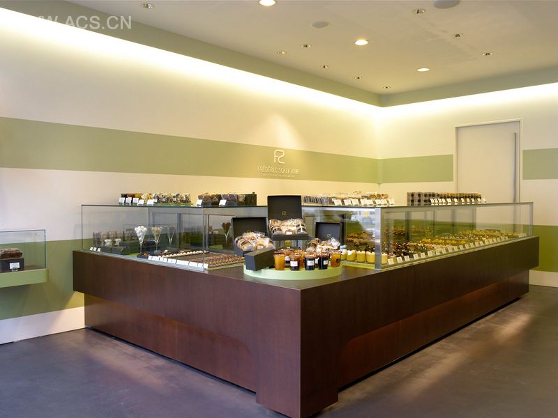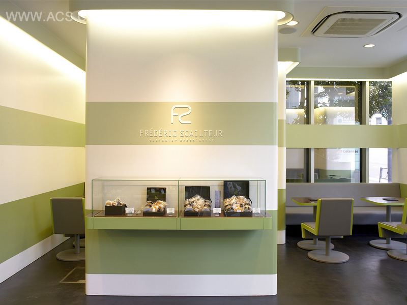 设计方Claudio Colucci Design为东京首家Frédéric Scailteur巧克力店进行设计。白色墙面以彩色带状图案做装饰,呈现三种渐变的橄榄绿色,并以黄金比例进行划分,加之黑色地板和白色墙艺吊顶,营造出一个简洁明朗的空间。这三色带状图案不仅是为装饰,更代表着该店的品牌标识。产品的包装标识和印刷资料同样由Claudio Colucci Design构思设计。