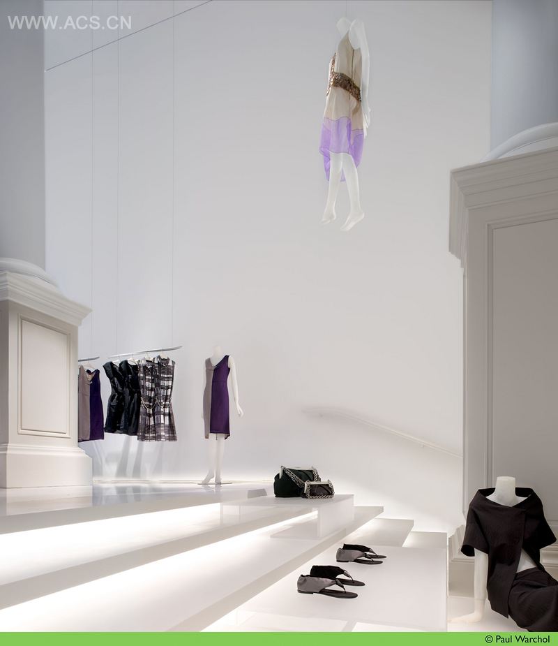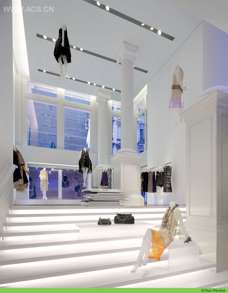 王薇薇专营店,位于苏荷铸铁古迹区,折射出设计师优雅奢华的品味。这个2000平方英尺的两层空间被设计来展示成衣及薰衣草系列,灯光及基于动态品质的白色盒子剧场,这是个无穷变幻的空间可用于各种活动,例如季节性的时装秀和当代艺术家的展览。