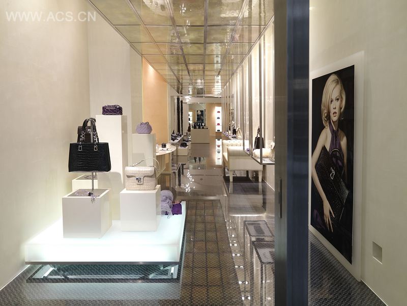 店内的地板为整体灯光色彩设计提供深色的微妙的背景,用特制的织物描绘的品牌商标被密封在透明的树脂中。