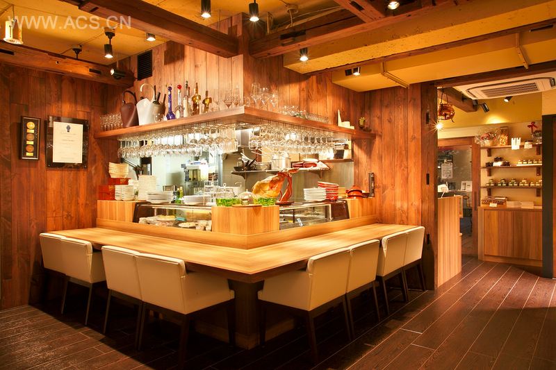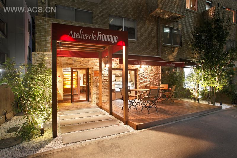 这是一家奶酪甜品店,也是一家咖啡厅风格的餐厅,位于东京青山。设计师重现了轻井泽度假胜地的环境。阳台上方植物旁边的红色遮蓬将顾客引向店内。开放式厨房、大餐桌和私人包房周围设有柜台。从窗户看去,墙壁被植物覆盖,顾客不管坐在哪里都可以感受到度假村的氛围。室内墙壁陈列了展示奶酪生产过程的图片。