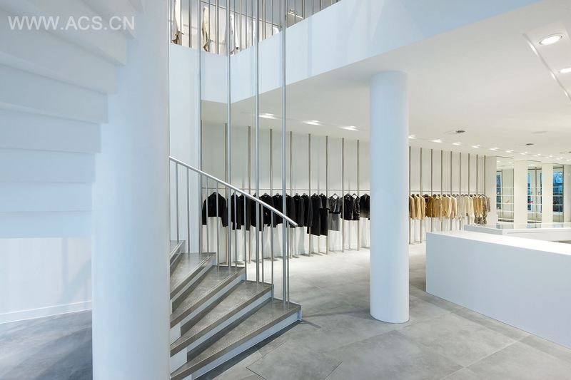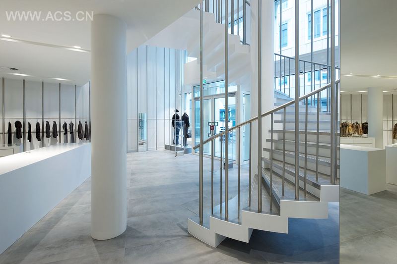 在这精巧的设计中,概念性与实用性被联系起来。笼式结构的铁栏杆与整体空间完美结合的同时,又能方便地作为衣架。铁格栅的主题贯穿整个前部,顺着墙面,越过橱窗,直至后面的螺旋楼梯。在一些特定位置,镜子的反射使得线性影像多次重现,仿佛永无止境。甚至在试衣间内,相对的两面镜子将挂衣杆来回反射,无穷无尽。“就好像是你从一间满是商品的商店走进了一个完全空着的店面——好似一个平行的空间。” 这一有趣的三维转换是Maurice Mentjens的一个标志性设计。