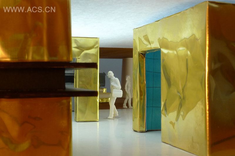 本案最终创造出一系列雕刻般的抽象体量,形成一个金色有着轻微形变的环境。项目质疑并折射出奢华的理念,一场构造与外观的游戏——事物并非其表面的模样。因此,简单的直角的盒子看起来是起伏和变形的,码头和巨大游艇的环境则被体现为热情洋溢的、复杂而庄严的……