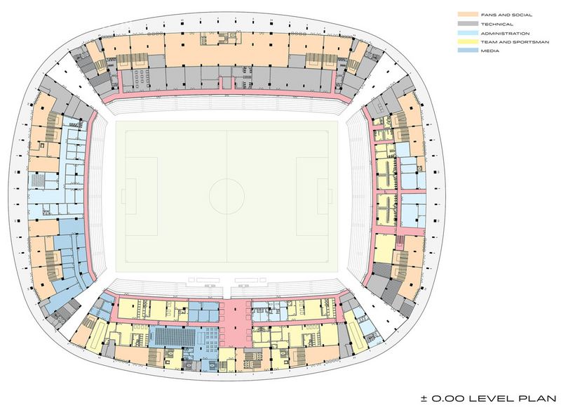 建筑的平面布置是根据欧足联的标准设计的。场馆分上下两层看台,总共可容纳42000人。看台是环形的,在东南西北四个方向均设有座位区。在观众就坐的看台下面有设置多个厕所和零售区,足够为场馆内的所有人提供服务。足球场根据国际足联和欧洲足联的标准铺设人工草皮,并且从地底对草皮进行加热。