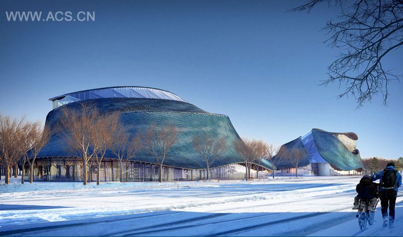 这两座博物馆建筑最令人瞩目的是其庞大、流线型的屋顶。这种用木质胶合层积材设计成网状构成屋顶梁体,不仅使建筑结构变轻,其独一无二的设计更是完美地融入了周边自然景观和博物馆主题。屋顶蓝色外观是由一片片蓝色琉璃片组合。琉璃瓦是能满足屋顶卷状设计的少数材质之一,也是现今匈牙利流行的建筑装饰。琉璃自身蓝青色的格调使得博物馆酷似冬日里树木的华盖,同时让这个有高度辨识感的项目与周围环境区分开。