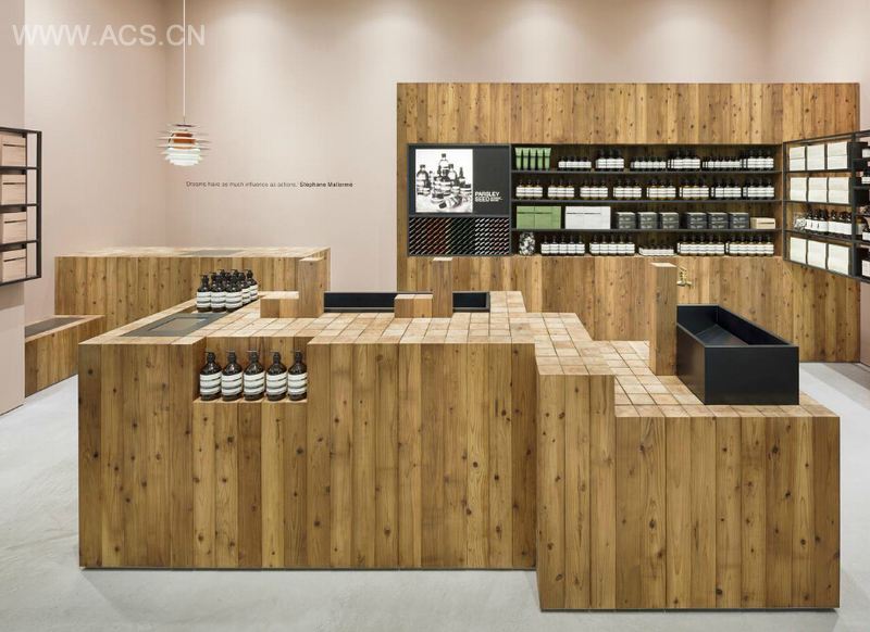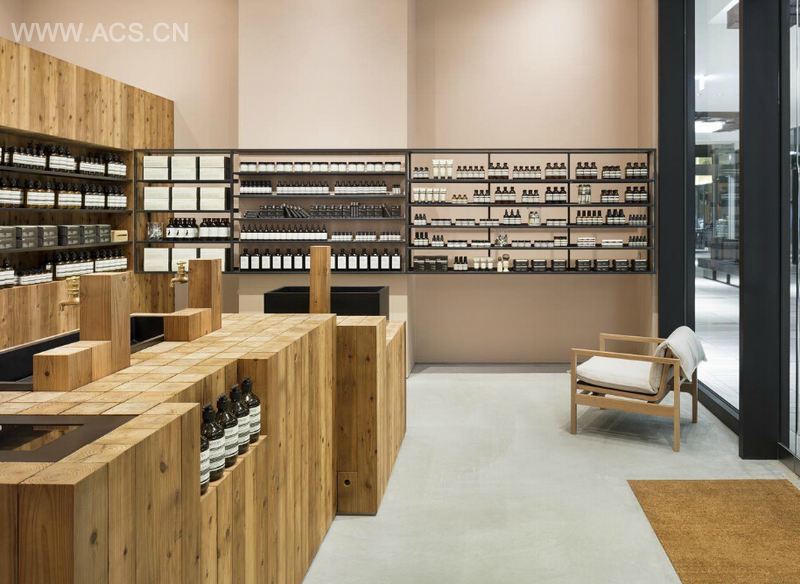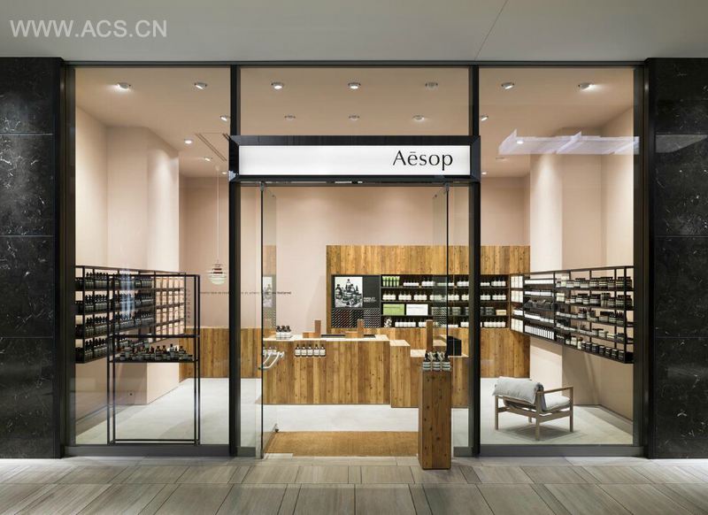 伊索 (Aesop)的每一款产品都是天然纯植物配方,这一品牌理念也体现在专卖店设计上,柔和的灯光、木质为主的装修材料、颜色搭配均给人以亲近、自然的感觉,区别其他化妆品店面的华丽和造作。店内的墙面布置了众多的产品展示柜,黑色与白色的强烈对比,显得空间更具深度与层次。